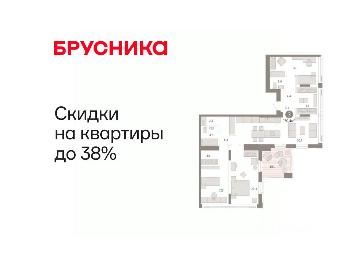 Квартира с кухней-гостиной и тремя спальнями в жилом районе "Зарека". Особенности планировки: второй санузел, гардеробная, лоджия, постирочная, разнесённые спальни, свободная планировка.