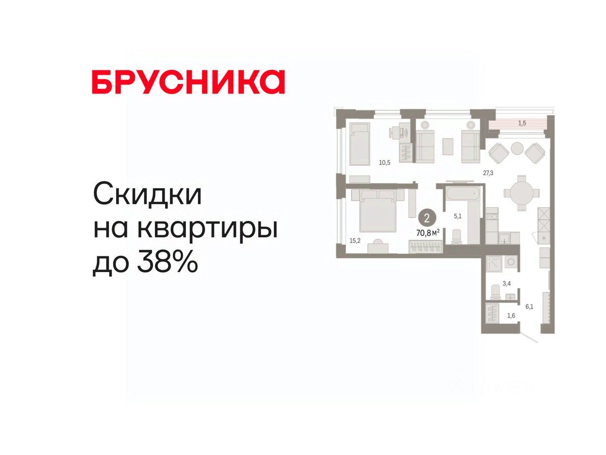 Квартира с кухней-гостиной и двумя спальнями в жилом районе "Зарека". Особенности планировки: гардеробная, мастер-спальня, предчистовая отделка, терраса на крыше.