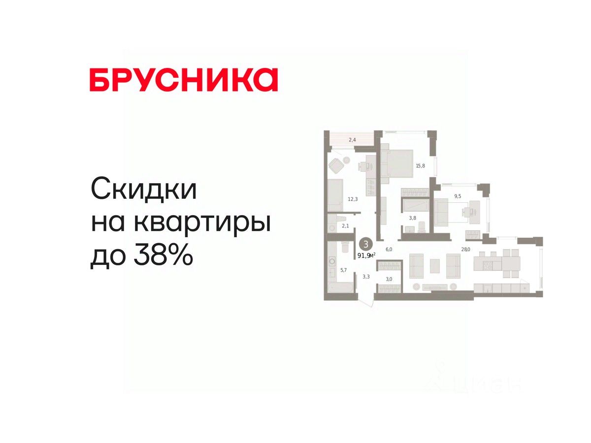 Квартира с кухней-гостиной и тремя спальнями в жилом районе "Зарека". Особенности планировки: гардеробная, мастер-спальня, постирочная, предчистовая отделка, терраса на крыше.
