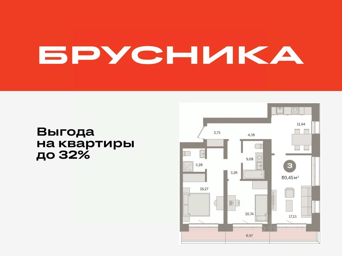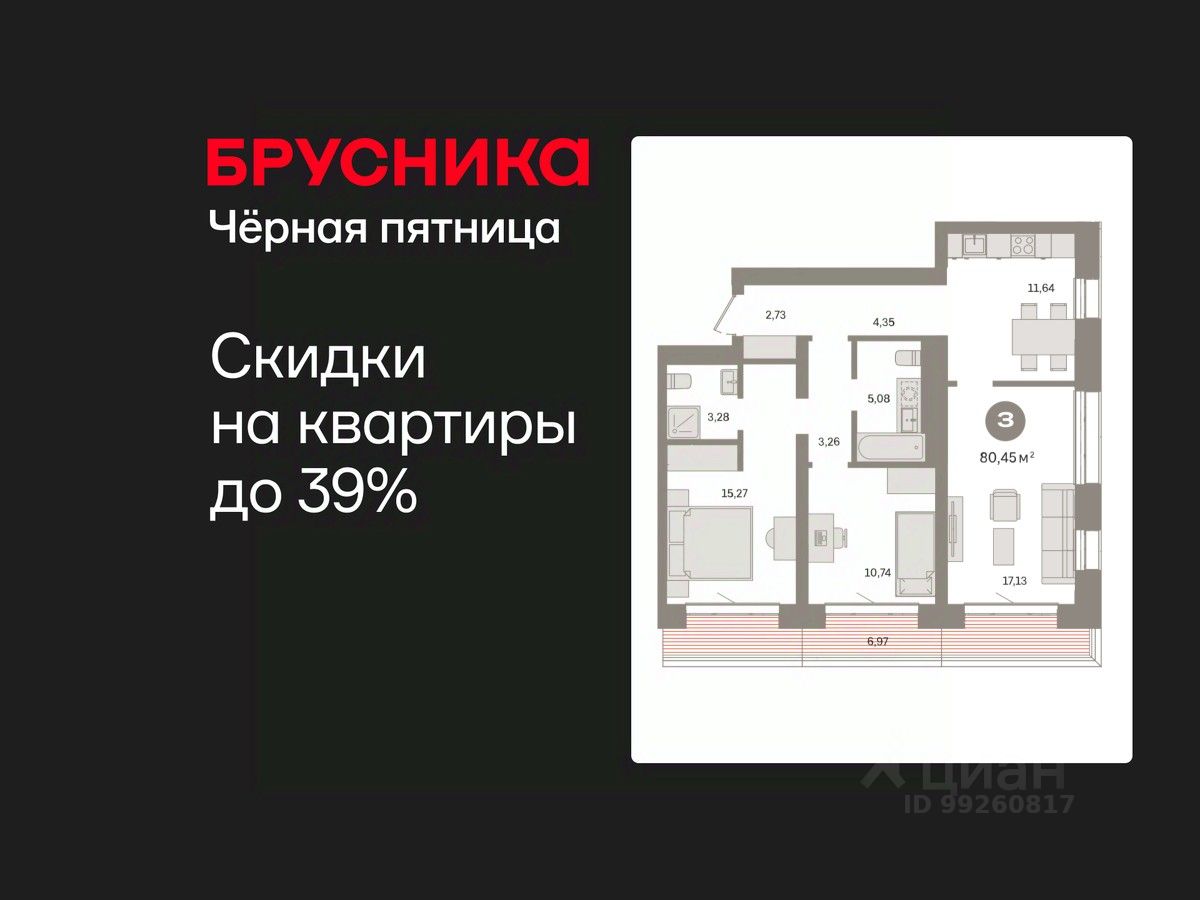 Квартира с кухней-гостиной и тремя спальнями в жилом районе "Речной порт". Особенности планировки: предчистовая отделка, мастер-спальня, терраса.
