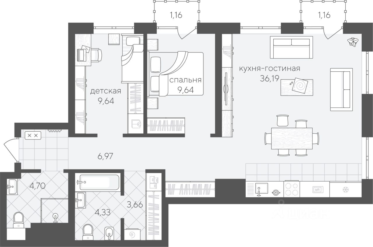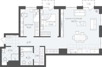 Двухкомнатная квартира 77.42 кв.м на 3 этаже — идеальный вариант для молодой семьи или пары. Просторная кухня-гостиная станет местом семейных встреч, а две спальни обеспечат удобство и приватность для каждого.
