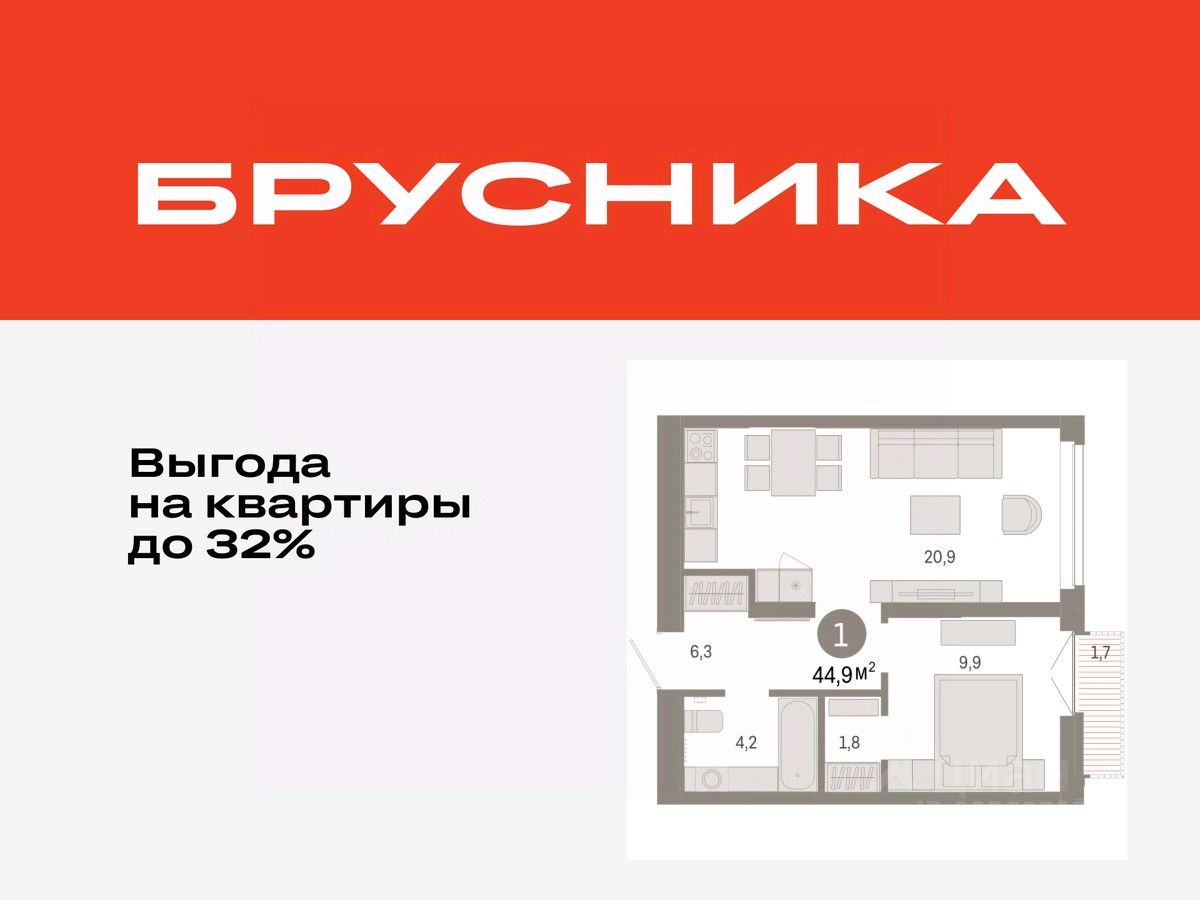 Продается 1-комн. квартира с предчистовой отделкой в ЖК "Республики 205" на 7 этаже. Общая площадь: 44.87 кв.м., жилая: 9.9 кв.м., площадь просторной кухни-гостиной: 20.9 кв.м. Все окна выходят на одну сторону. В квартире один балкон, один совмещенный санузел. Высота потолков 2.7 м.