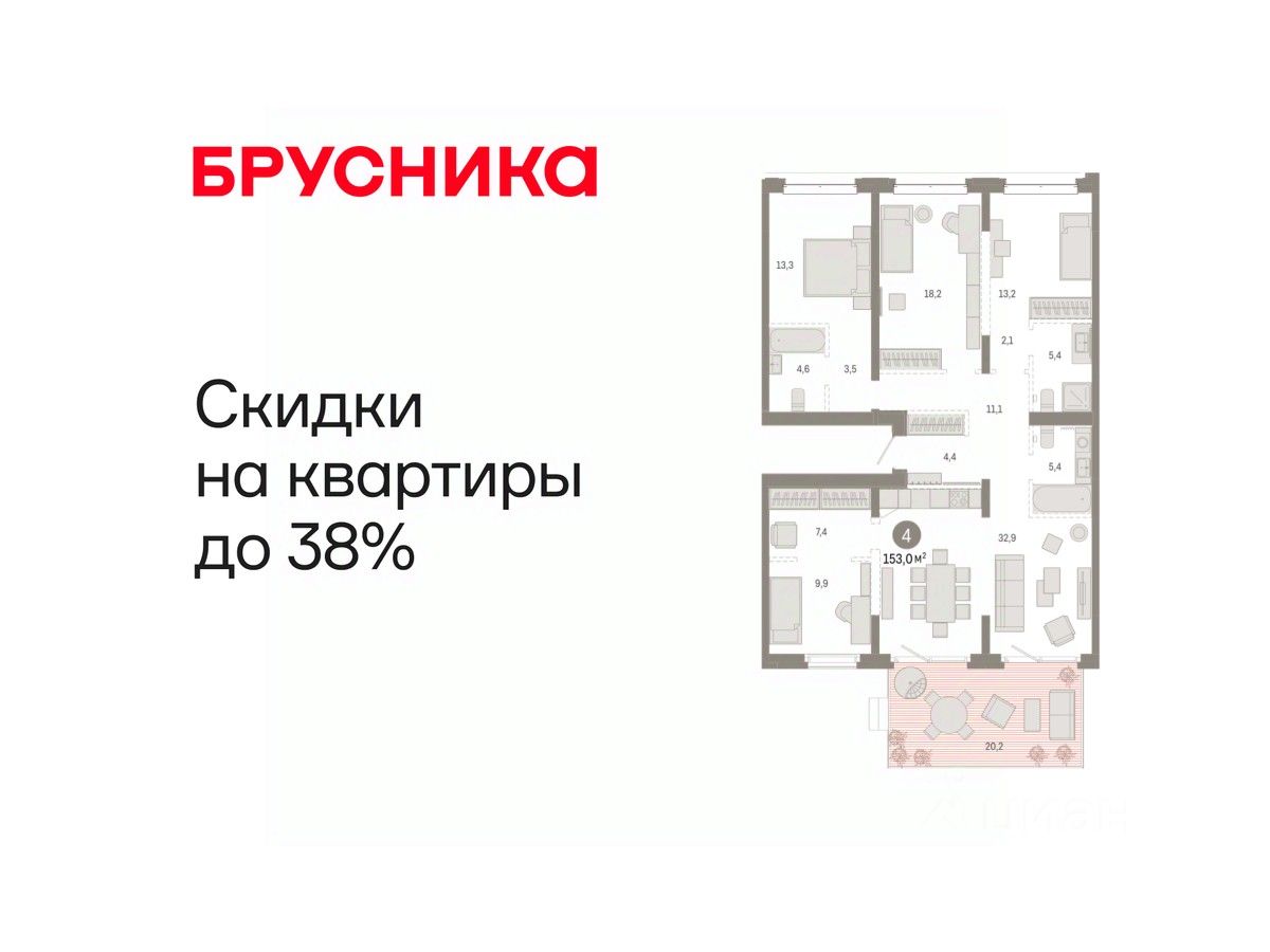 Квартира с кухней-гостиной и четырьмя спальнями в кварталах "На Минской". Особенности планировки: вид во двор, второй санузел, гардеробная, окна в пол, окна на две стороны, панорамное остекление, предчистовая отделка, разнесённые спальни, терраса.