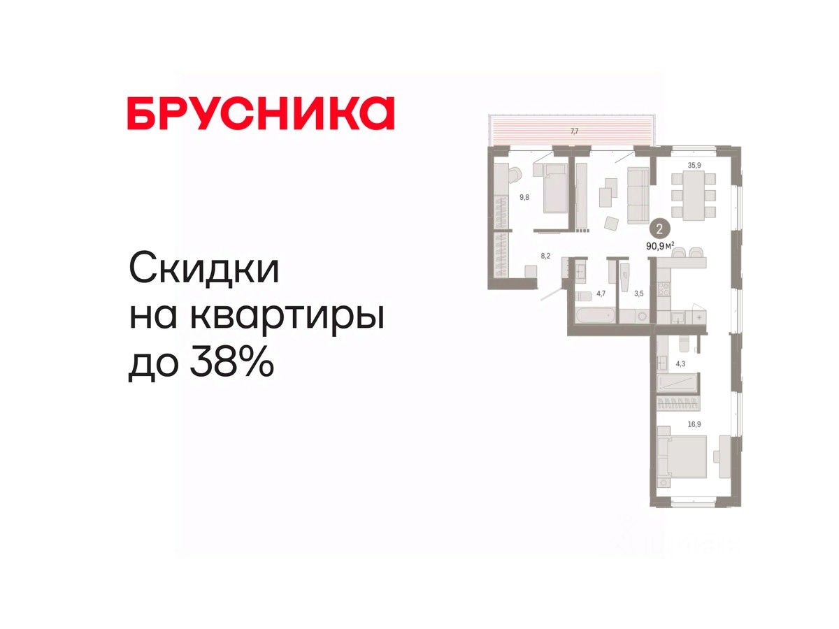 2-комн. квартира с предчистовой отделкой в Кварталы "На Минской" на 3 этаже. Общая площадь: 90.9 кв.м., жилая: 26.7 кв.м., площадь просторной кухни-гостиной: 35.9 кв.м. Квартира без проходных комнат, окна выходят нa три cтopoны дома. В квартире один балкон, два совмещенных санузла. Высота потолков 2.7 м.