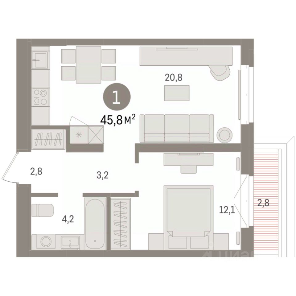 Однокомнатная квартира с предчистовой отделкой в Кварталы "На Минской" на 6 этаже. Общая площадь: 45.82 кв.м., жилая: 12.1 кв.м., площадь просторной кухни-гостиной: 20.8 кв.м. Все окна выходят на одну сторону. В квартире один балкон, один совмещенный санузел. Высота потолков 2.7 м.