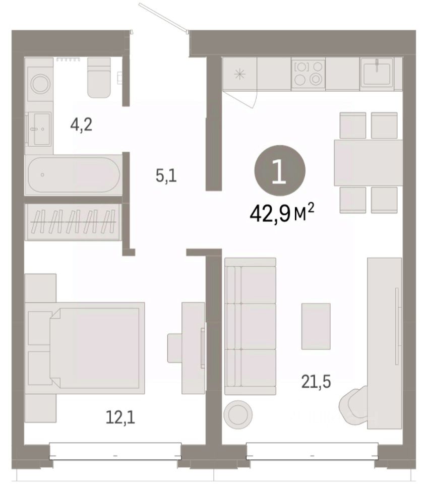 Квартира с кухней-гостиной и одной спальней в кварталах "На Минской". Особенности планировки: предчистовая отделка.