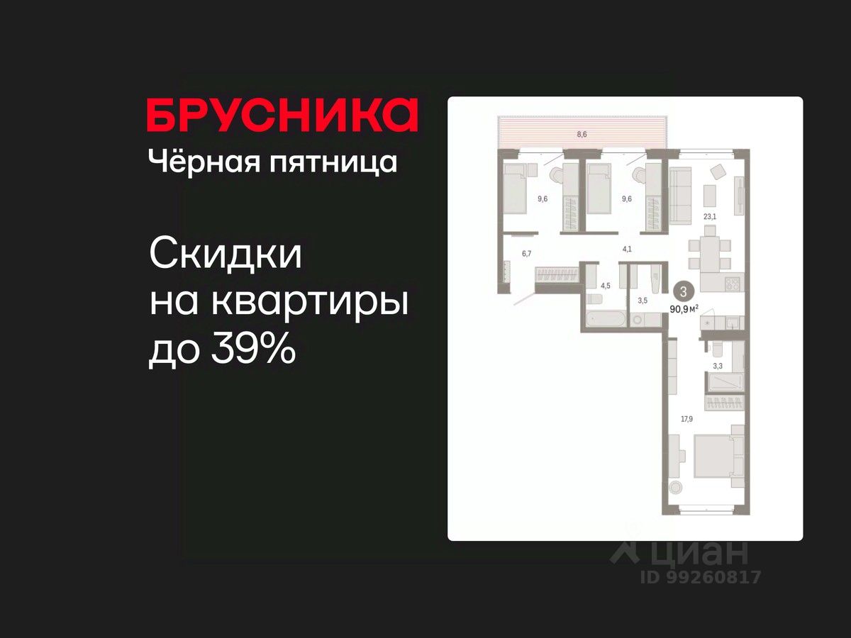 Квартира с кухней-гостиной и тремя спальнями в кварталах "На Минской". Особенности планировки: окна на две стороны, вид во двор, разнесённые спальни, предчистовая отделка, мастер-спальня, постирочная, балкон.