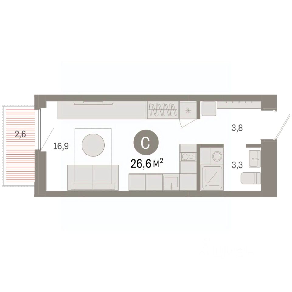 Однокомнатная студия с предчистовой отделкой в ЖК "Зарека" на 14 этаже. Общая площадь: 26.57 кв.м., площадь гостиной 16.9 кв.м., из которых 5 кв.м. выделено под кухонную зону. Все окна выходят на одну сторону. В квартире один балкон, один совмещенный санузел. Высота потолков 2.7 м.