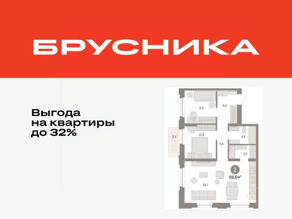 Квартира с кухней-гостиной и двумя спальнями в жилом районе "Зарека". Особенности планировки: предчистовая отделка, постирочная, балкон.