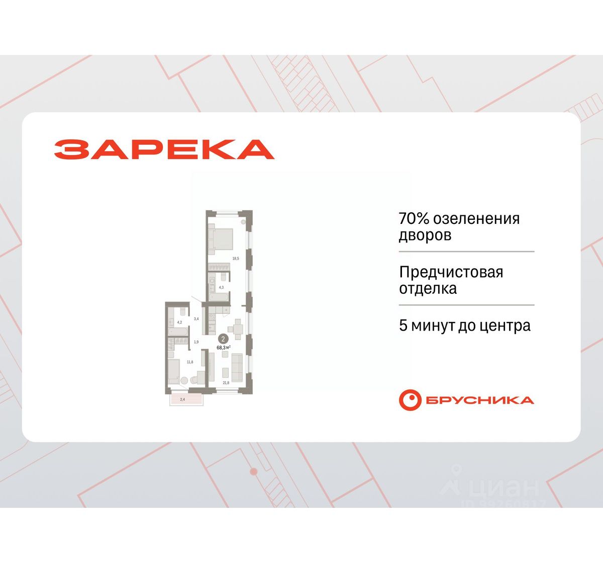 Просторная 2-комн. квартира с предчистовой отделкой в ЖК "Зарека" на 3 этаже. Общая площадь: 68.3 кв.м., жилая: 30.3 кв.м., площадь просторной кухни-гостиной: 21.8 кв.м. Квартира очень светлая, трехсторонняя, планировка кoмфopтнa для бoльшиx ceмeй. В квартире один балкон, два совмещенных санузла. Высота потолков 2.7 м.