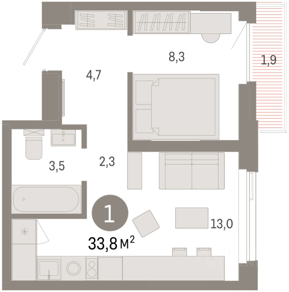 Просторная 1-комн. квартира с предчистовой отделкой в ЖК "Зарека" на 10 этаже. Общая площадь: 33.81 кв.м., жилая: 8.3 кв.м., площадь просторной кухни-гостиной: 13 кв.м. Все окна выходят на одну сторону. В квартире один балкон, один совмещенный санузел. Высота потолков 2.7 м.