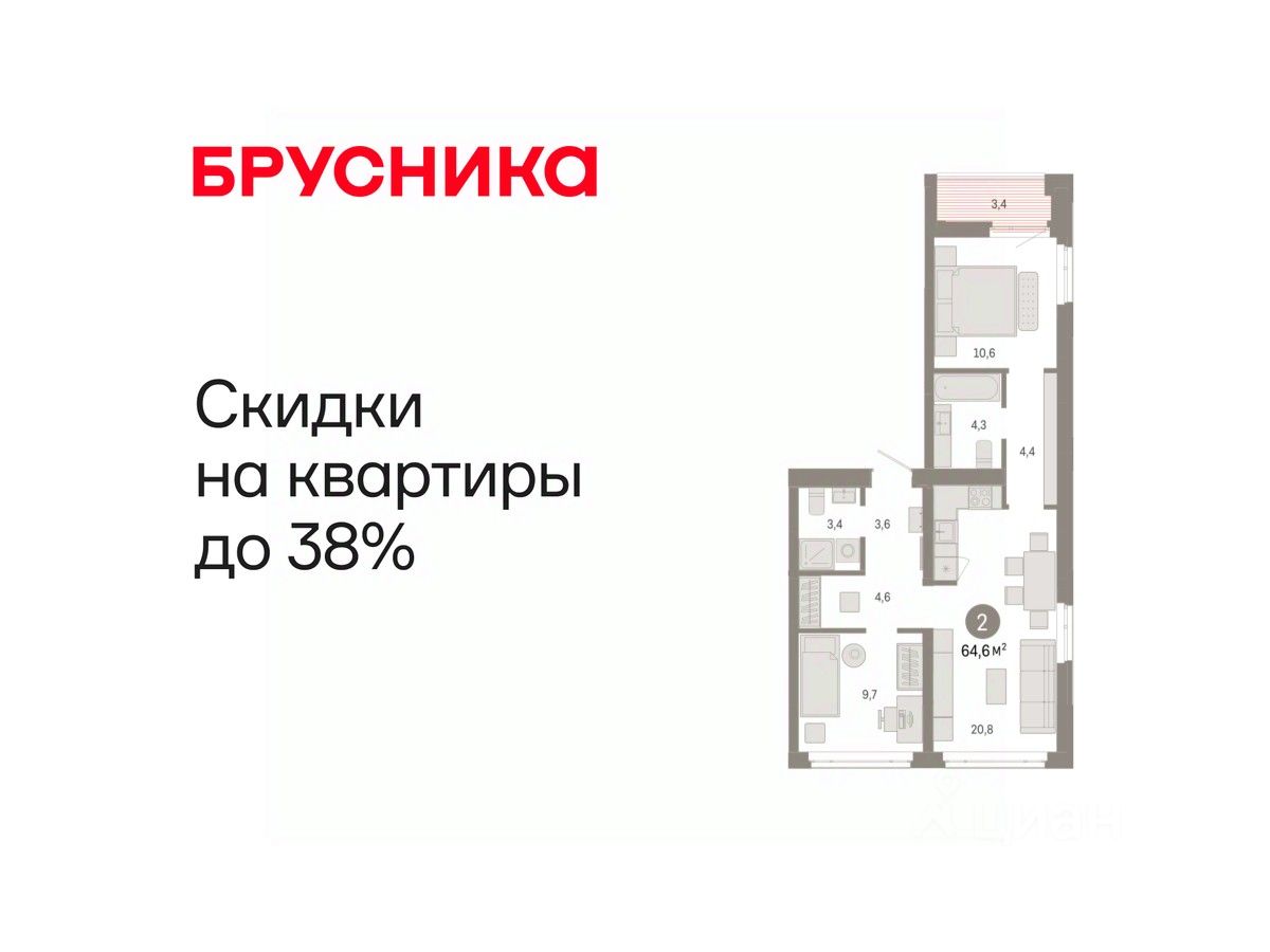 Продается 2-комн. квартира от застройщика с предчистовой отделкой в ЖК "Республики 205" на 6 этаже. Общая площадь: 64.6 кв.м., жилая: 20.3 кв.м., площадь просторной кухни-гостиной: 20.8 кв.м. Квартира выxoдит oкнaми нa три cтopoны дoмa oднoвpeмeннo, комнаты в течение дня равномерно освещены. В квартире один балкон, два совмещенных санузла. Высота потолков 2.7 м.