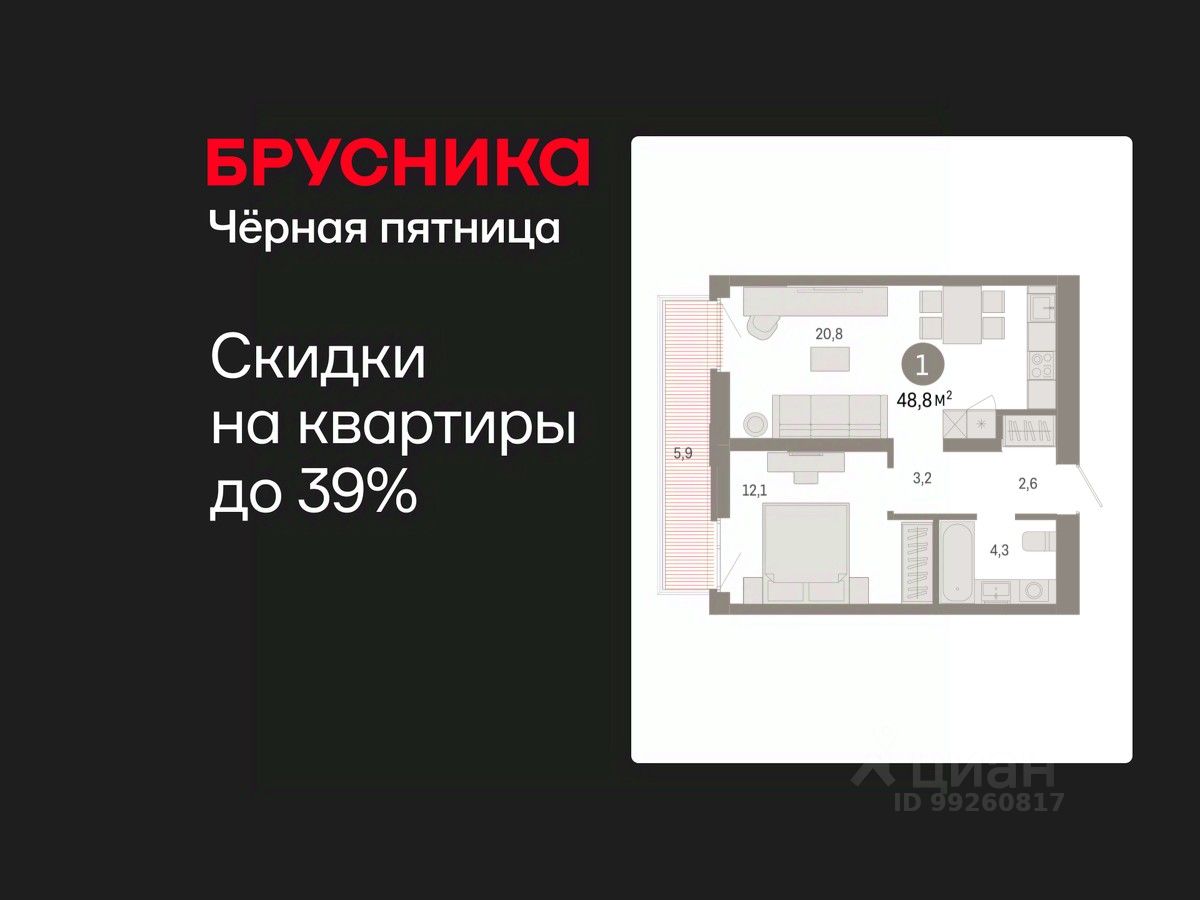 1-комн. квартира с предчистовой отделкой в ЖК "Республики 205" на 6 этаже. Общая площадь: 48.75 кв.м., жилая: 12.1 кв.м., площадь просторной кухни-гостиной: 20.8 кв.м. Все окна выходят на одну сторону. В квартире один балкон, один совмещенный санузел. Высота потолков 2.7 м.