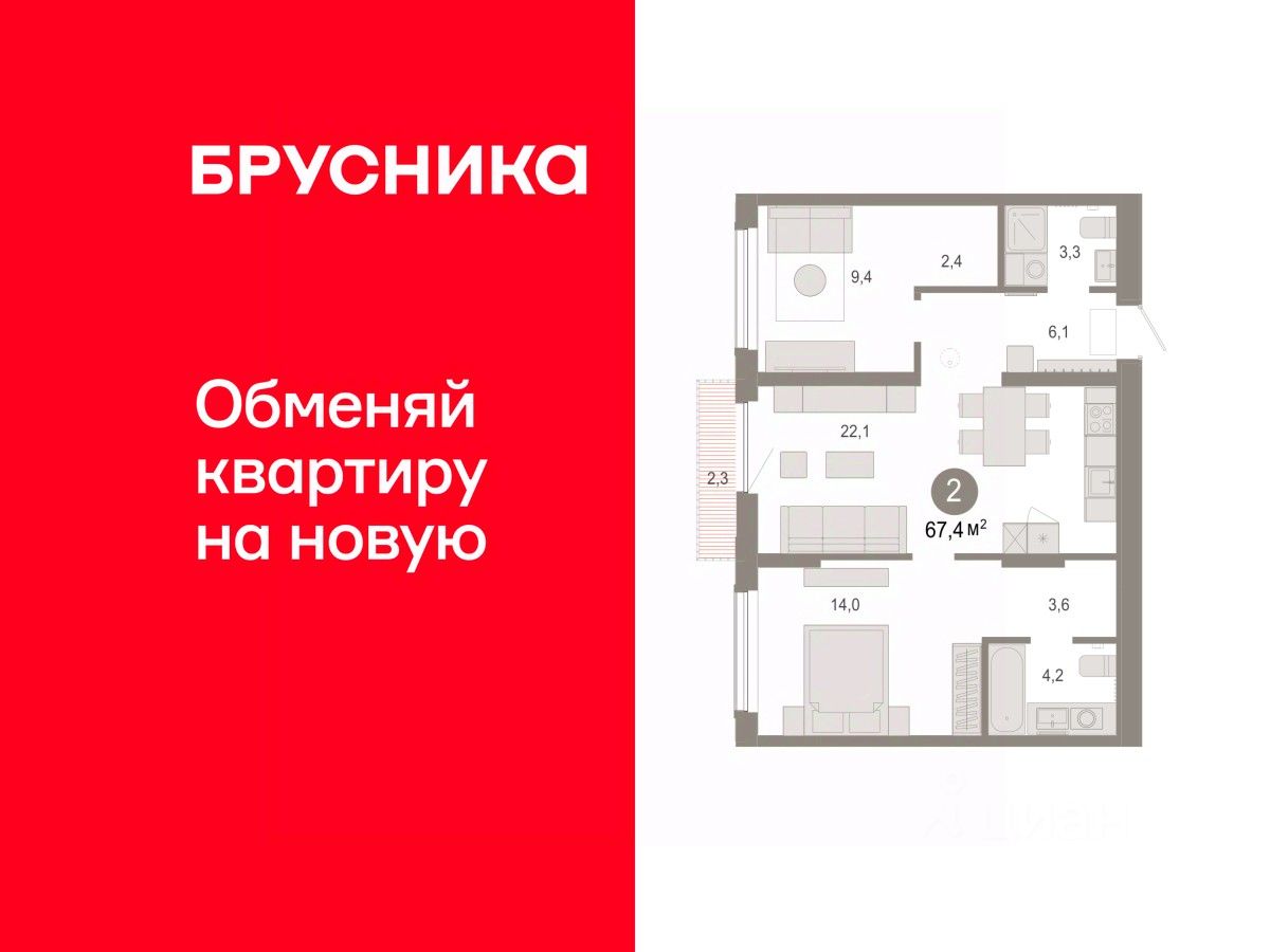 Квартира с кухней-гостиной и двумя спальнями в Октябрьском на Туре. Особенности планировки: балкон, предчистовая отделка, разнесённые спальни.