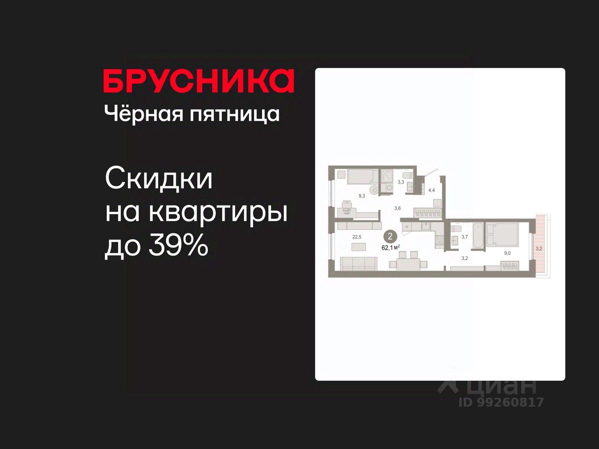 Квартира с кухней-гостиной и двумя спальнями в Октябрьском на Туре. Особенности планировки: второй санузел, вид во двор, разнесённые спальни, предчистовая отделка, терраса на крыше.