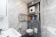 В квартире свежий косметический ремонт. Стены ровные, поклеены обоями, на полу линолеум, натяжные потолки с точечным освещением, теплый пол в санузле.