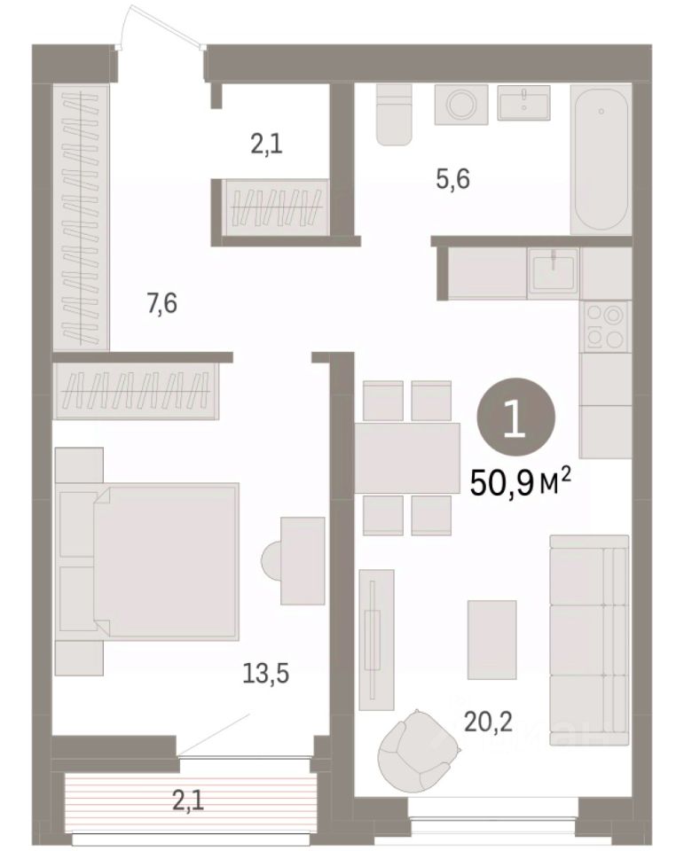 Квартира с кухней-гостиной и одной спальней в жилом районе "Речной порт". Особенности планировки: гардеробная, лоджия, предчистовая отделка.
