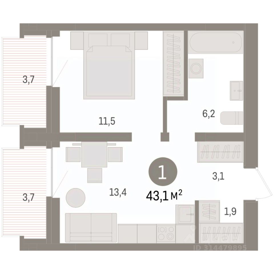 Квартира с кухней-гостиной и одной спальней в жилом районе "Речной порт". Особенности планировки: гардеробная, предчистовая отделка, балкон.