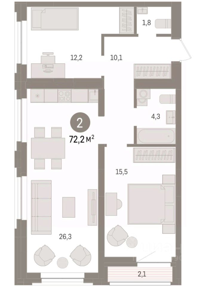 Квартира с кухней-гостиной и двумя спальнями в жилом районе "Речной порт". Особенности планировки: второй санузел, лоджия, разнесённые спальни, предчистовая отделка.