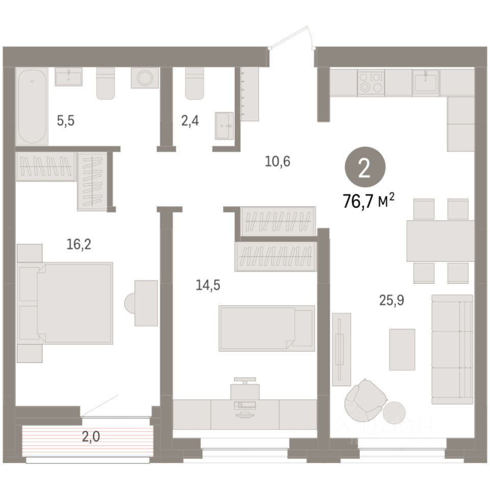 Квартира с кухней-гостиной и двумя спальнями в жилом районе "Речной порт". Особенности планировки: второй санузел, лоджия, предчистовая отделка.