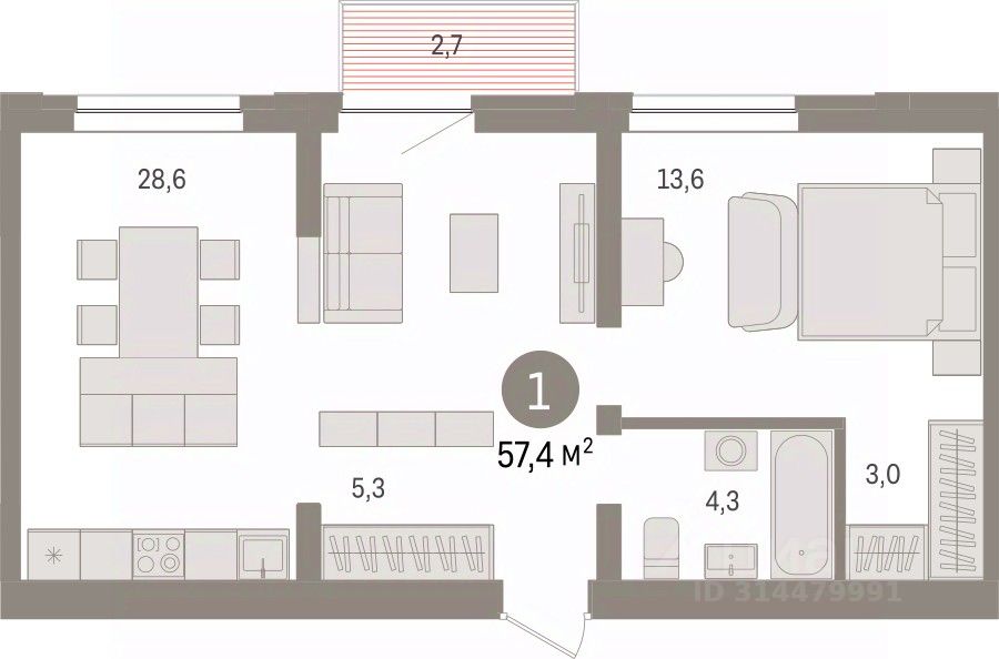 Квартира с кухней-гостиной и одной спальней в жилом районе "Речной порт". Особенности планировки: балкон, предчистовая отделка.