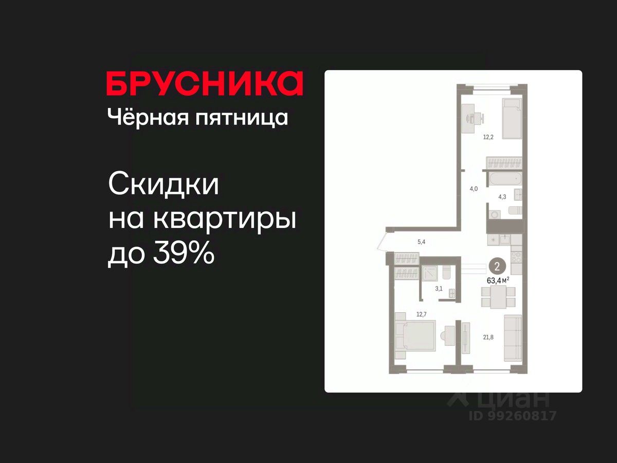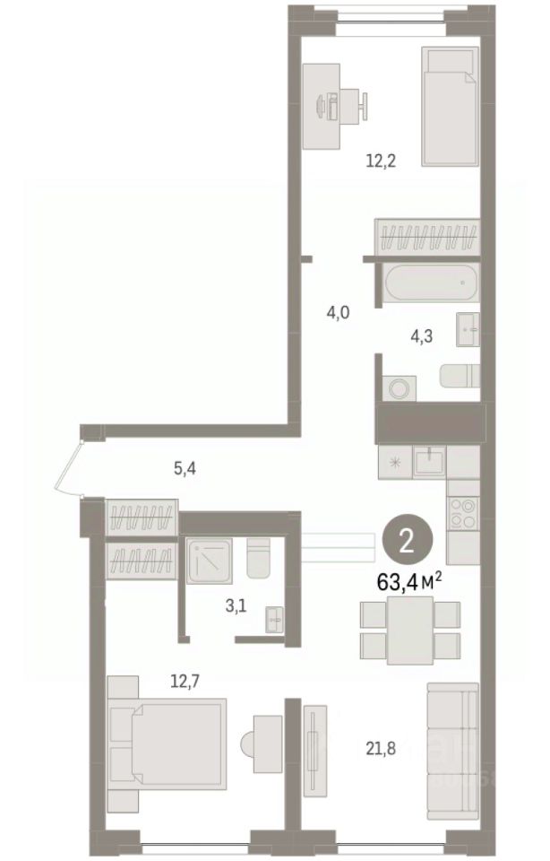 Квартира с кухней-гостиной и двумя спальнями в жилом районе "Речной порт". Особенности планировки: вид во двор, разнесённые спальни, предчистовая отделка, мастер-спальня.