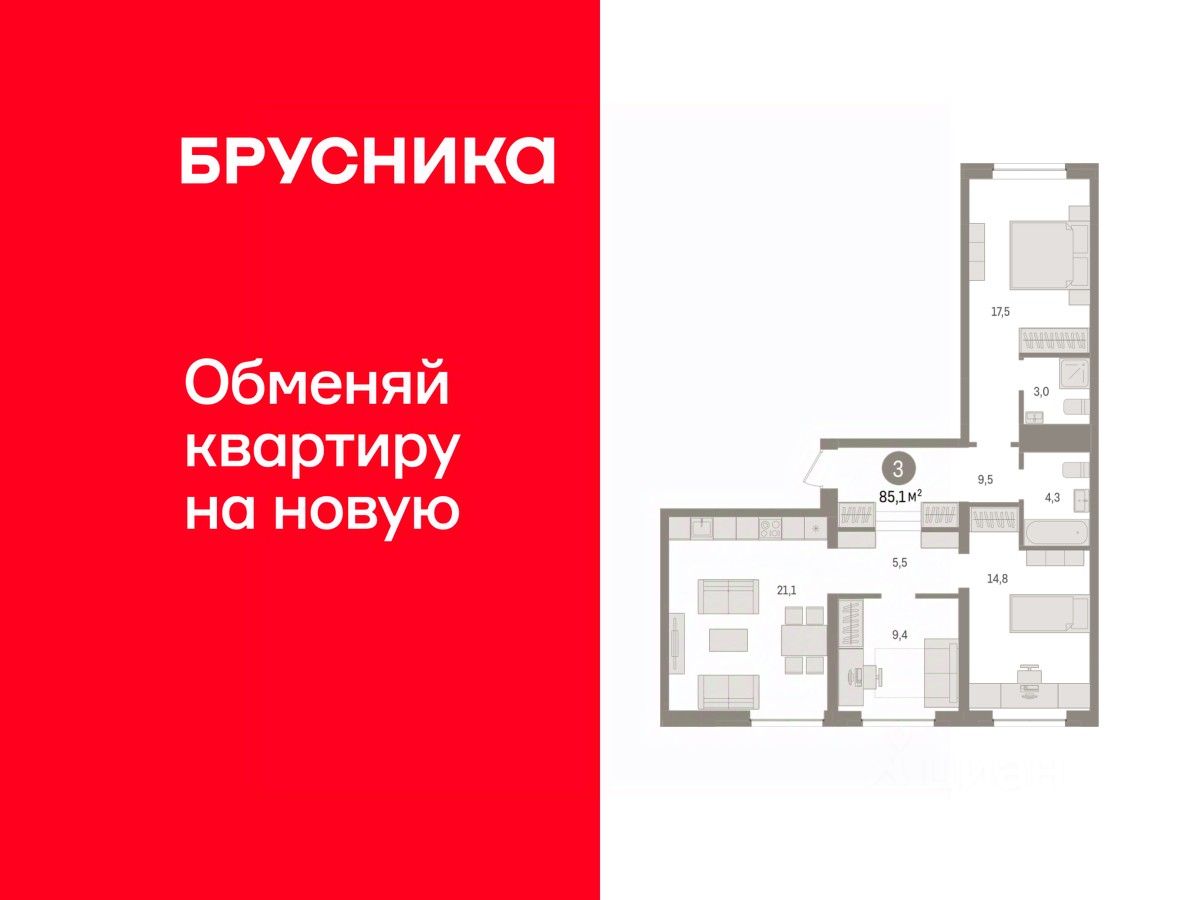 Квартира с кухней-гостиной и тремя спальнями в жилом районе "Речной порт". Особенности планировки: предчистовая отделка, разнесённые спальни.