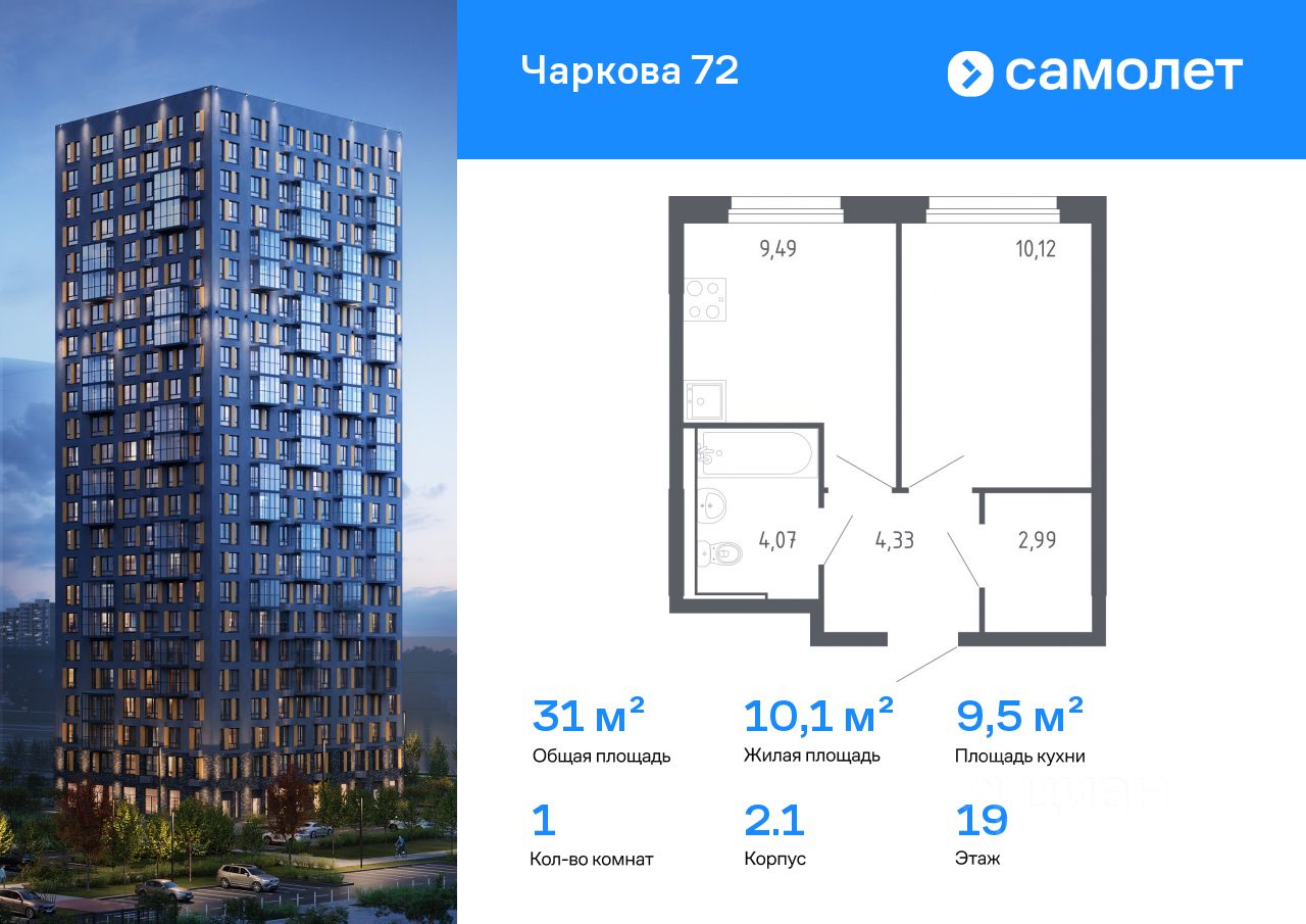 Предлагается 1-комнатная квартира комфорт-класса 31 кв.м в корпусе 2.1 на 19 этаже, в ЖК "Чаркова 72"