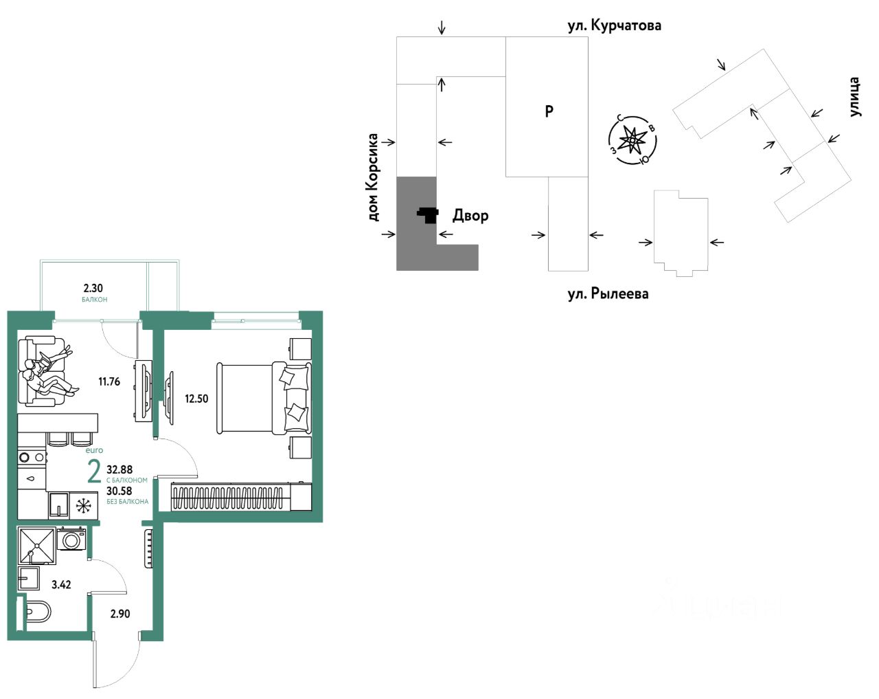 Продается 2комнатная квартира на 6 этаже от застройщика Страна Девелопмент. Площадь квартиры 32,88 кв. м.
