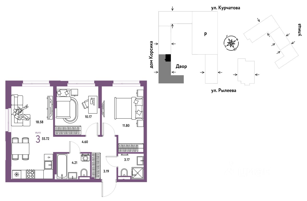 Продается 3комнатная квартира на 16 этаже от застройщика Страна Девелопмент. Площадь квартиры 55,72 кв. м.