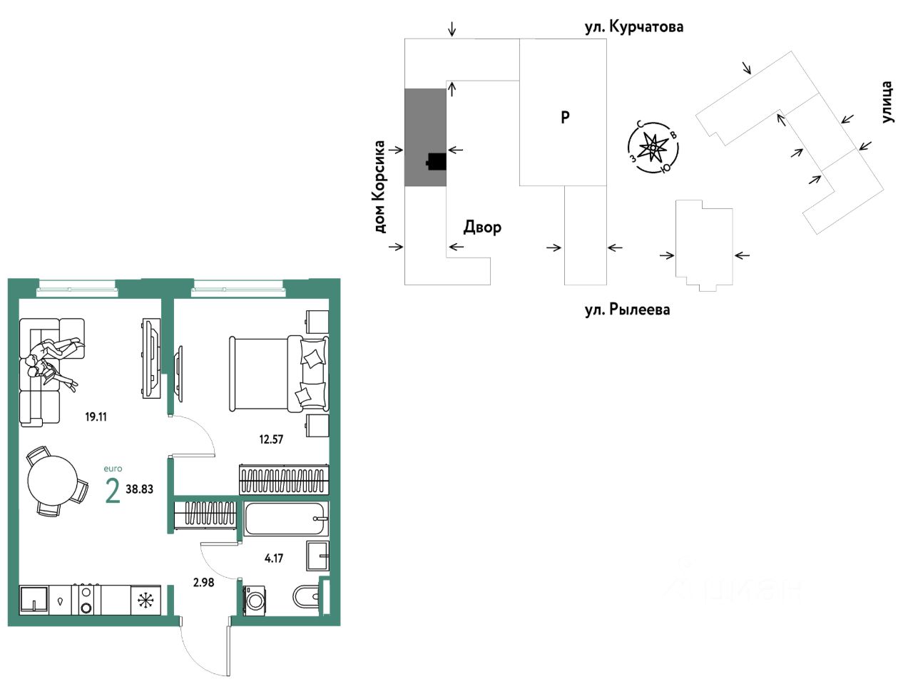 Продается 2комнатная квартира на 4 этаже от застройщика Страна Девелопмент. Площадь квартиры 38,83 кв. м.