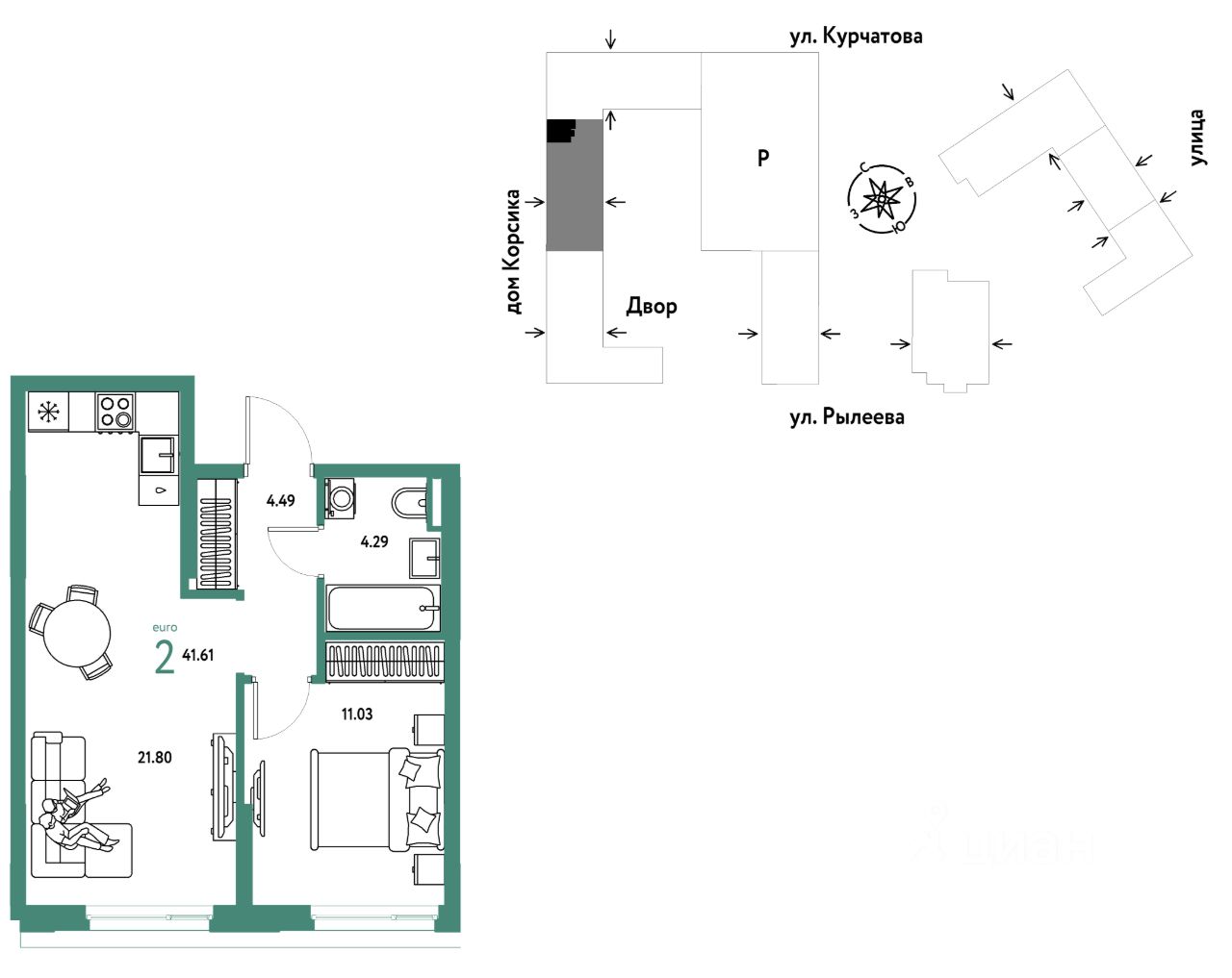 Продается 2комнатная квартира на 5 этаже от застройщика Страна Девелопмент. Площадь квартиры 41,61 кв. м.