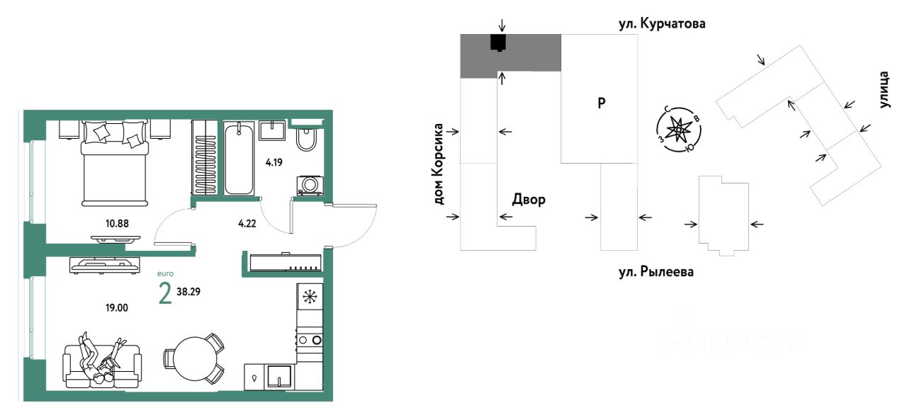 Продается 2комнатная квартира на 2 этаже от застройщика Страна Девелопмент. Площадь квартиры 38,29 кв. м.