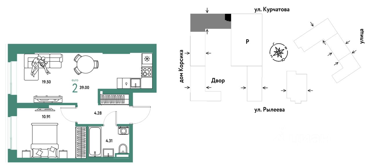 Продается 2комнатная квартира на 2 этаже от застройщика Страна Девелопмент. Площадь квартиры 39 кв. м.