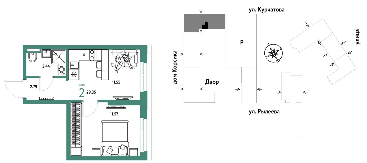 Продается 2комнатная квартира на 2 этаже от застройщика Страна Девелопмент. Площадь квартиры 29,35 кв. м.
