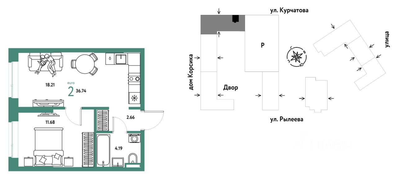 Продается 2комнатная квартира на 5 этаже от застройщика Страна Девелопмент. Площадь квартиры 36,74 кв. м.