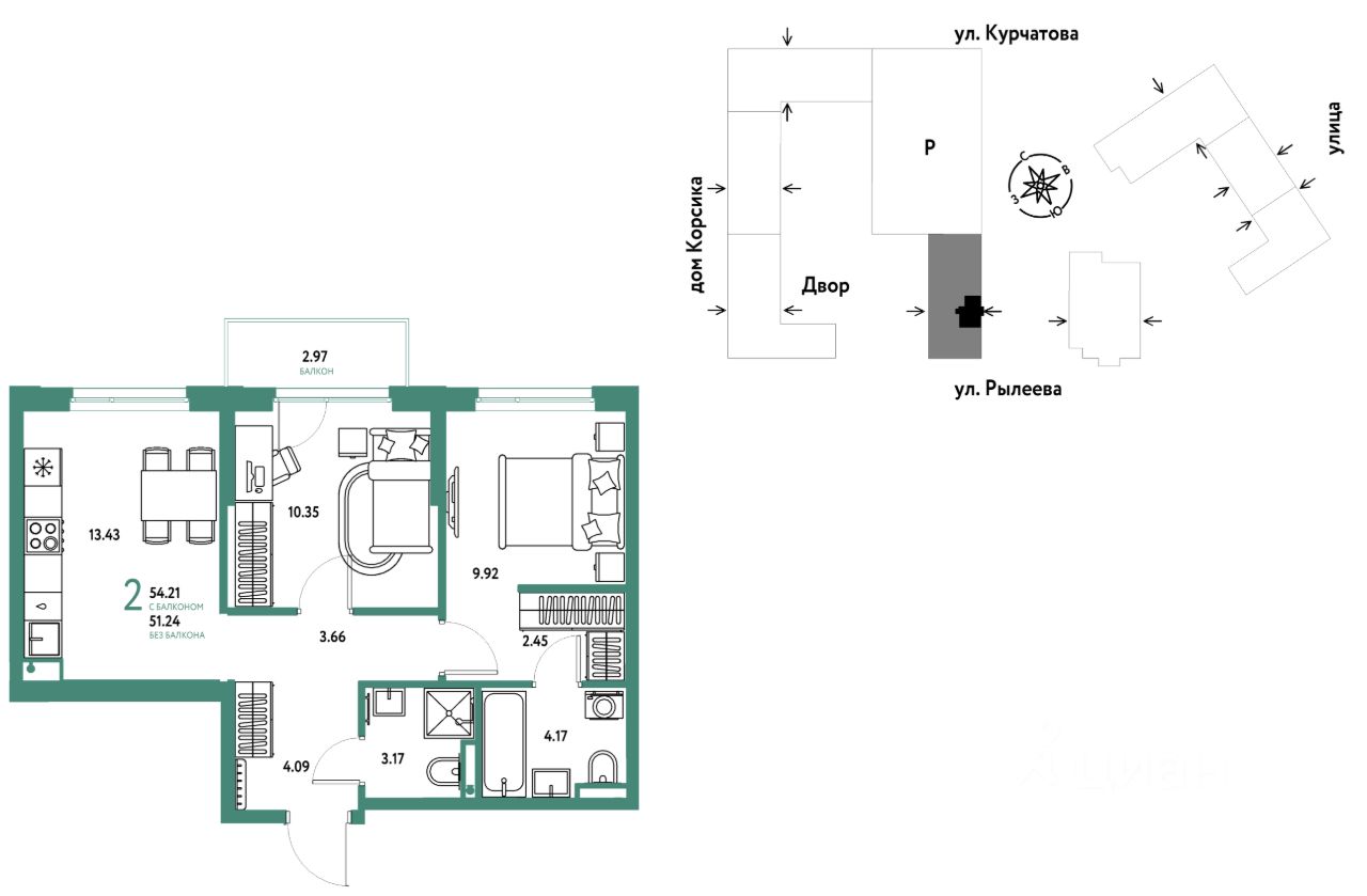 Продается 2комнатная квартира на 4 этаже от застройщика Страна Девелопмент. Площадь квартиры 54,21 кв. м.