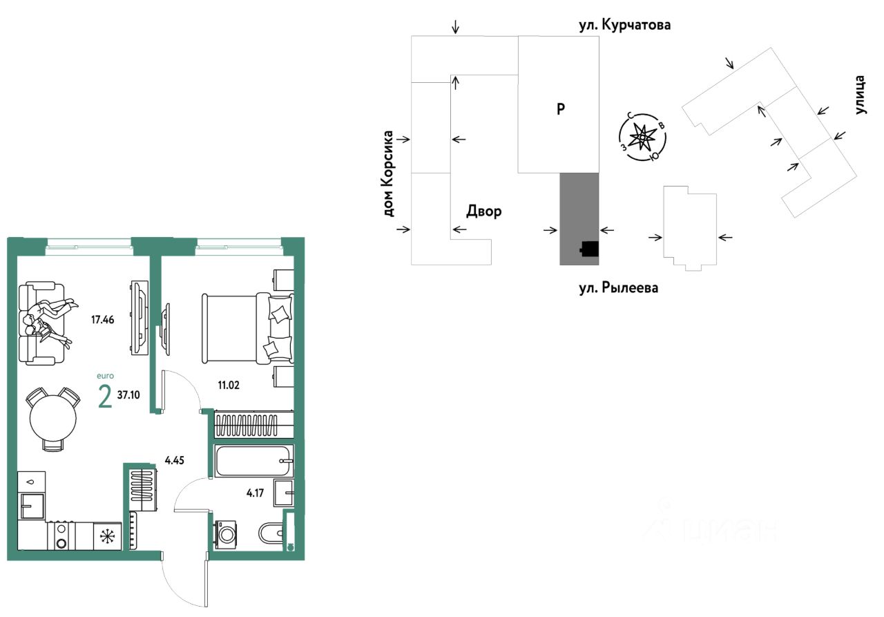 Продается 2комнатная квартира на 6 этаже от застройщика Страна Девелопмент. Площадь квартиры 37,1 кв. м.