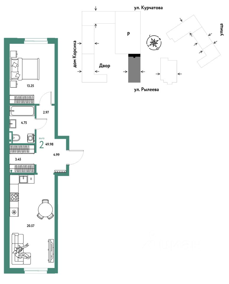 Продается 2комнатная квартира на 9 этаже от застройщика Страна Девелопмент. Площадь квартиры 49,98 кв. м.