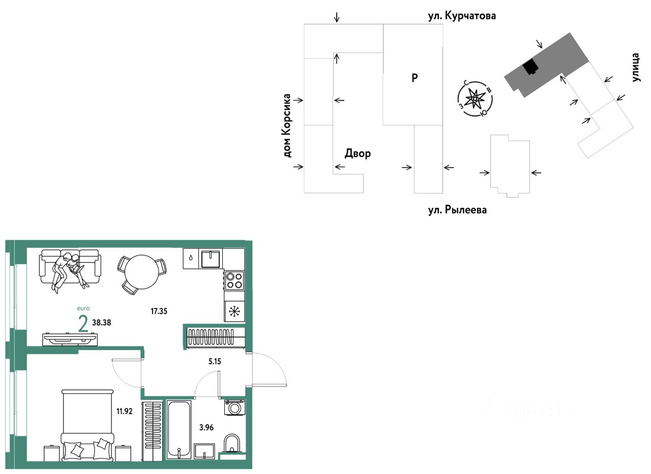 Продается 2комнатная квартира на 4 этаже от застройщика Страна Девелопмент. Площадь квартиры 38,38 кв. м.