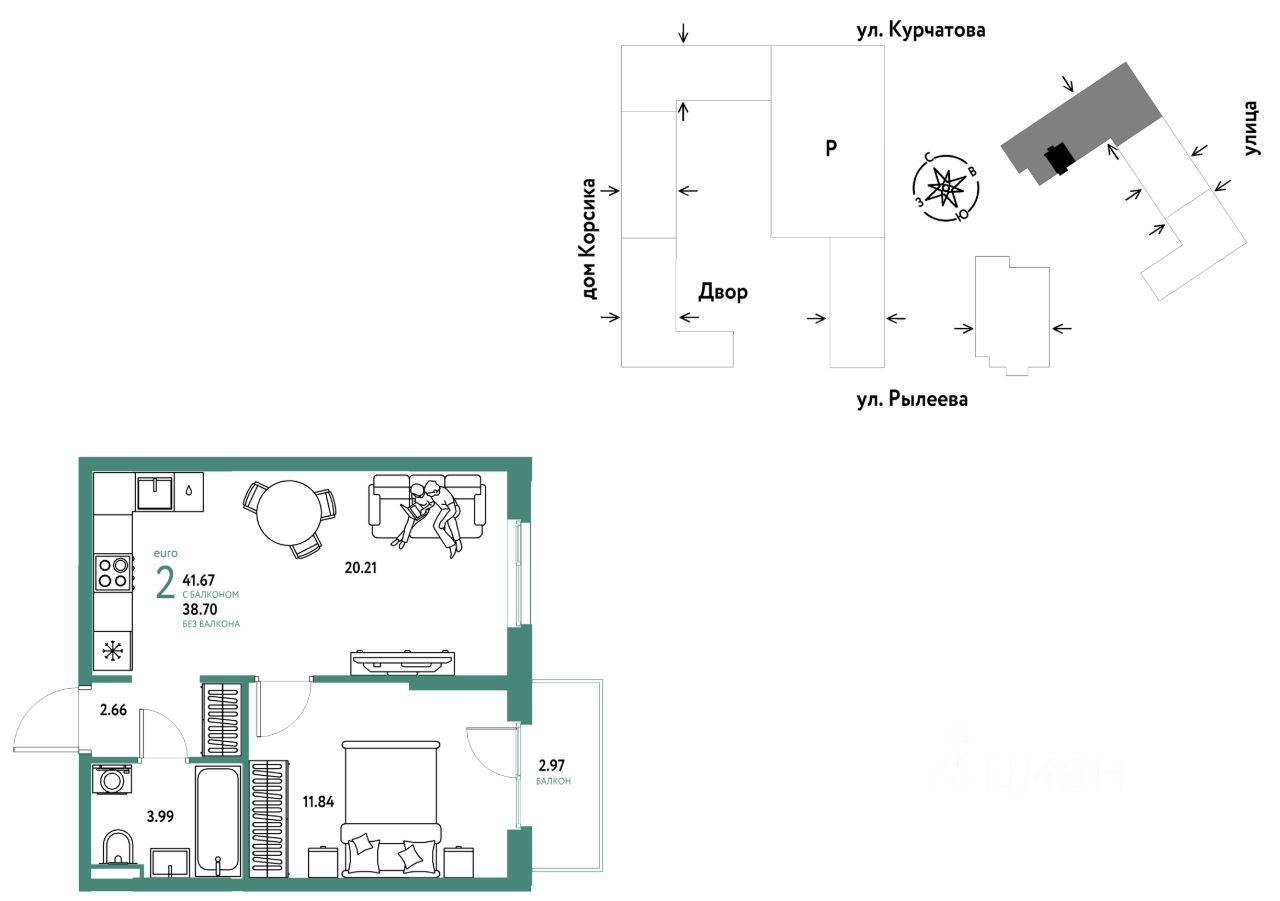 Продается 2комнатная квартира на 5 этаже от застройщика Страна Девелопмент. Площадь квартиры 41,67 кв. м.