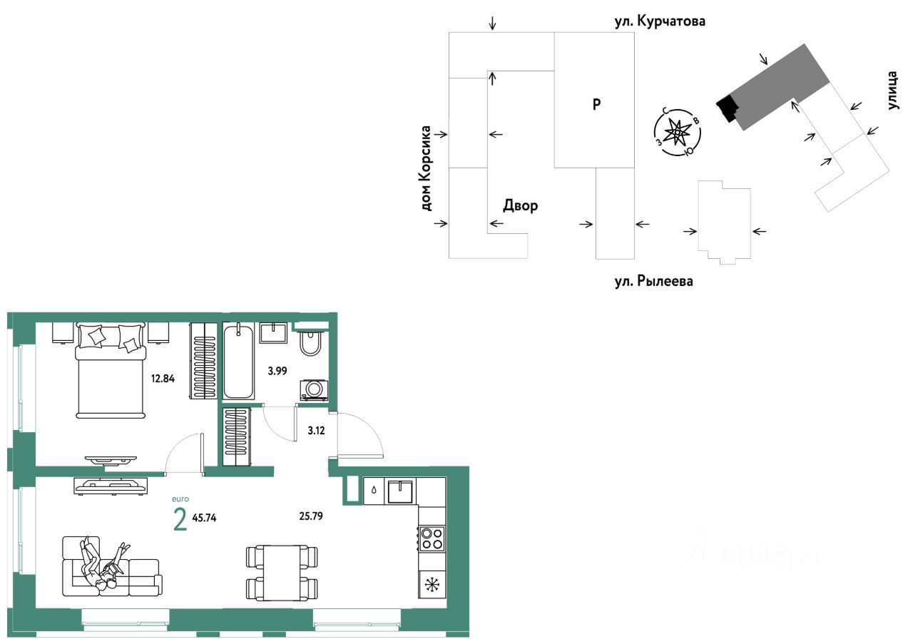 Продается 2комнатная квартира на 8 этаже от застройщика Страна Девелопмент. Площадь квартиры 45,74 кв. м.