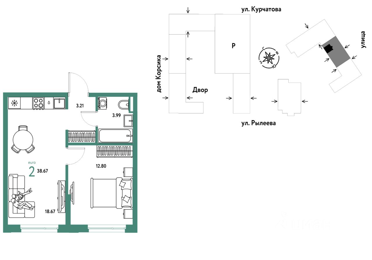 Продается 2комнатная квартира на 6 этаже от застройщика Страна Девелопмент. Площадь квартиры 38,67 кв. м.