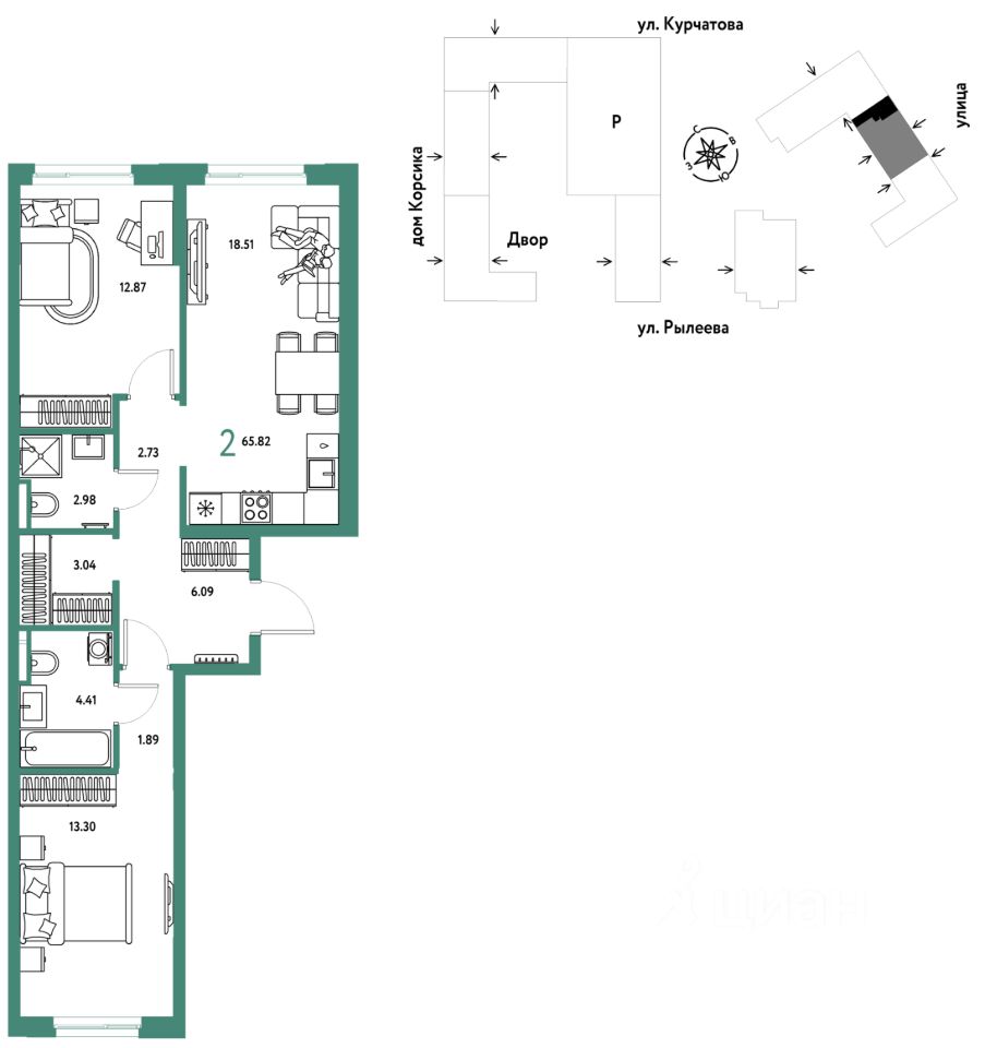 Продается 2комнатная квартира на 8 этаже от застройщика Страна Девелопмент. Площадь квартиры 65,82 кв. м.