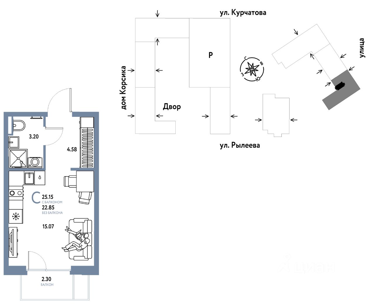 Продается 1комнатная квартира на 3 этаже от застройщика Страна Девелопмент. Площадь квартиры 25,15 кв. м.