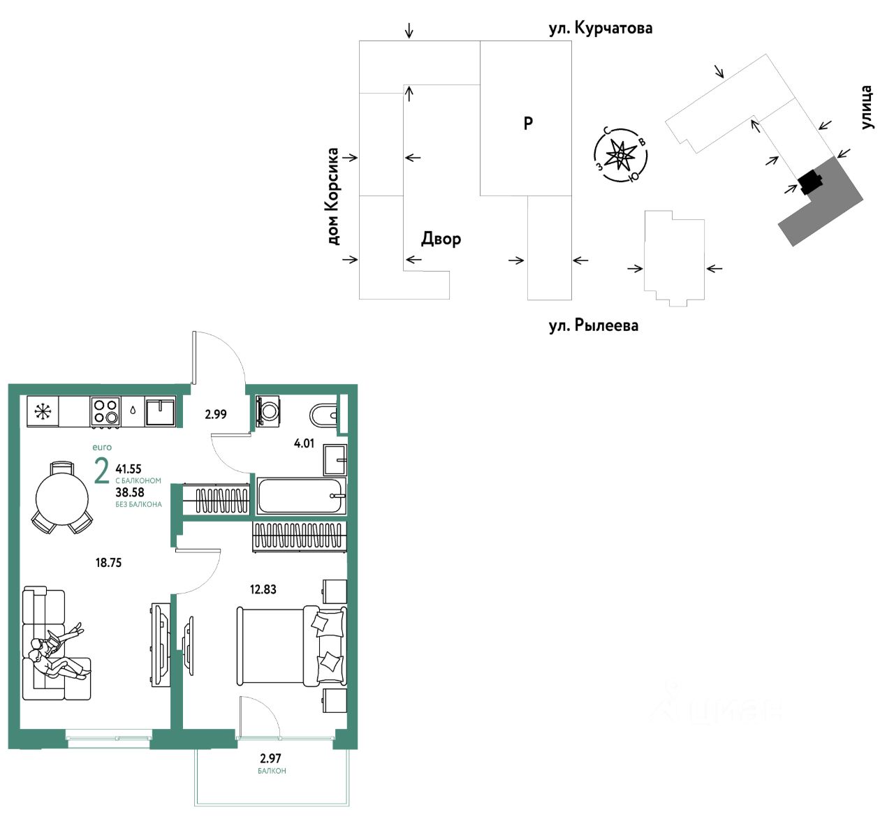 Продается 2комнатная квартира на 6 этаже от застройщика Страна Девелопмент. Площадь квартиры 41,55 кв. м.