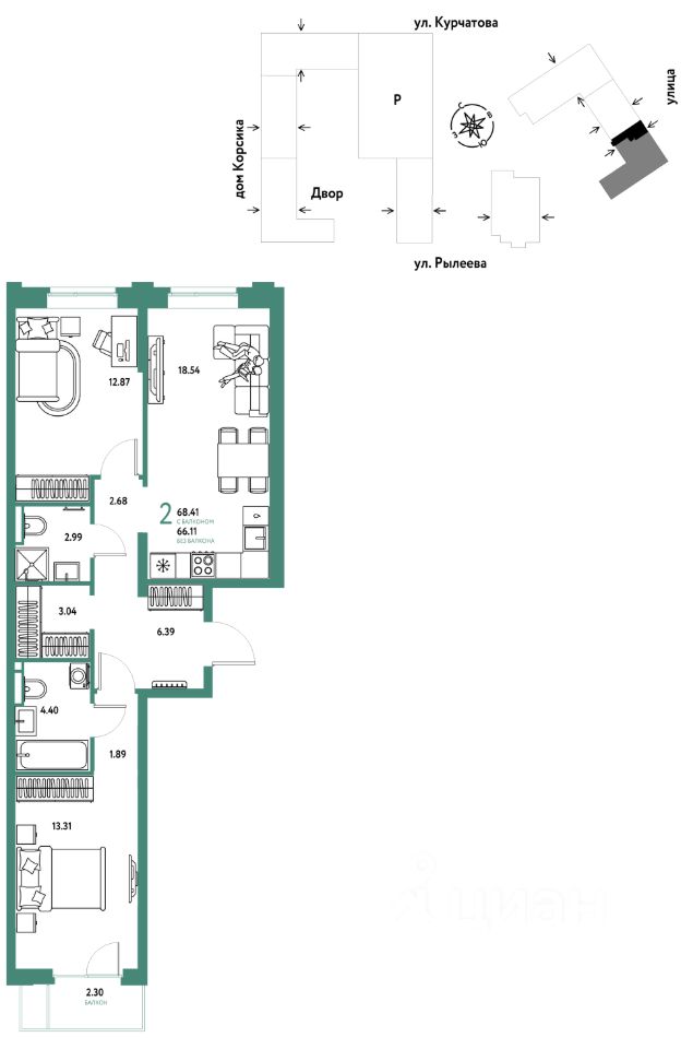 Продается 2комнатная квартира на 8 этаже от застройщика Страна Девелопмент. Площадь квартиры 68,41 кв. м.