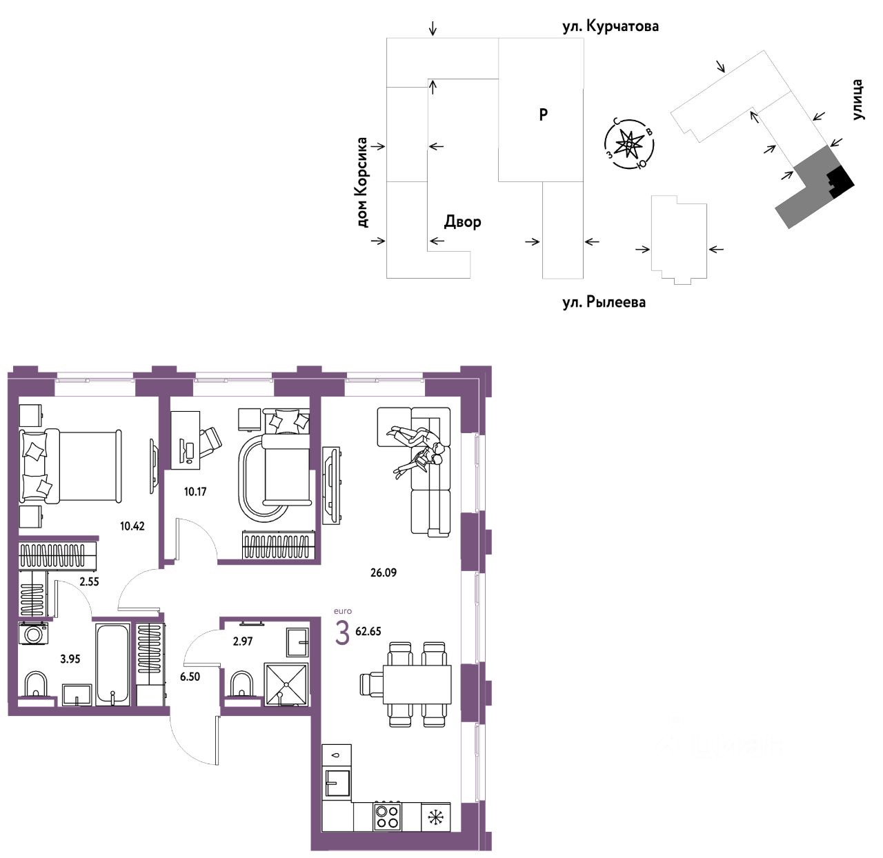 Продается 3комнатная квартира на 16 этаже от застройщика Страна Девелопмент. Площадь квартиры 62,65 кв. м.