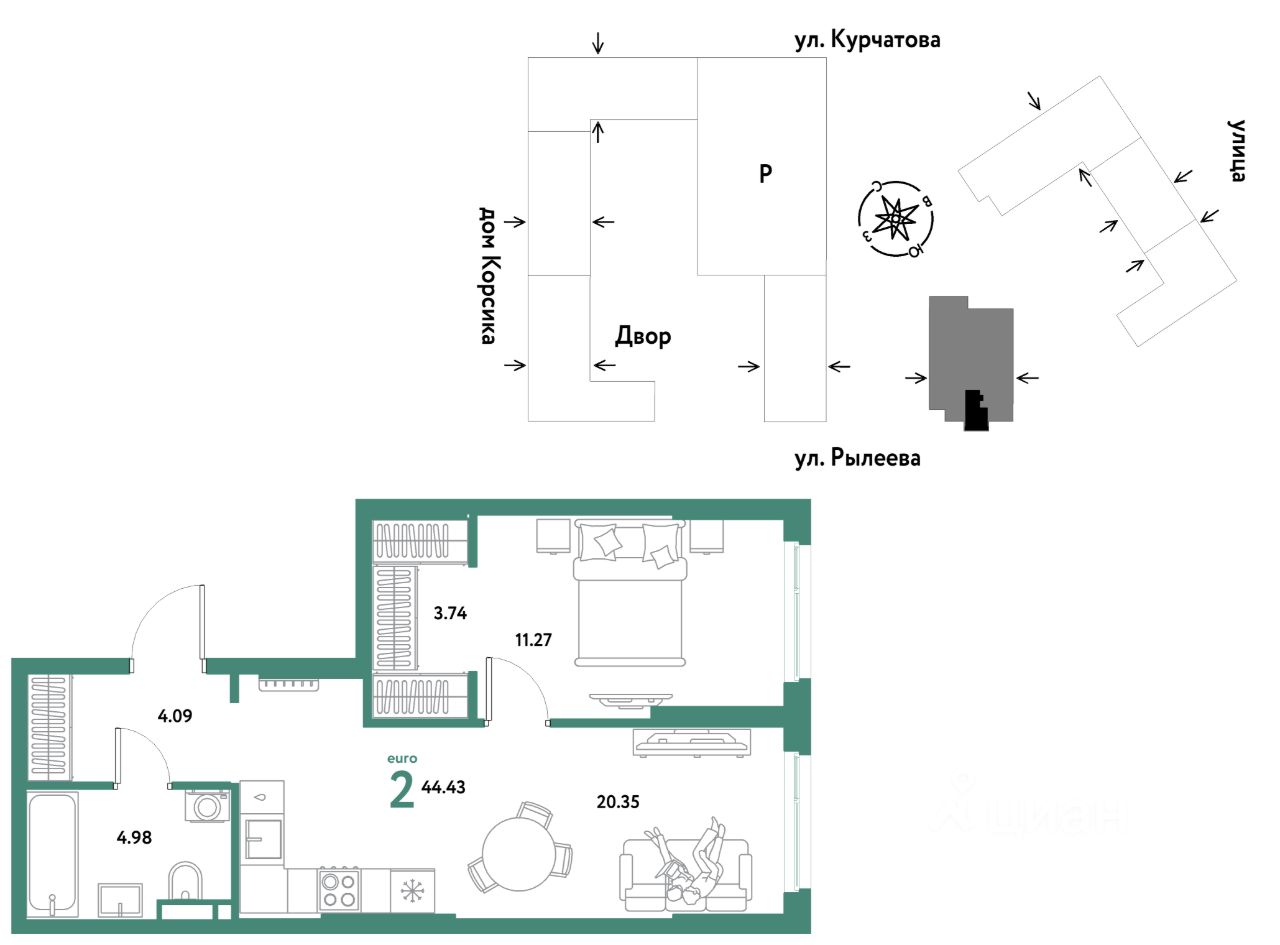 Продается 2комнатная квартира на 2 этаже от застройщика Страна Девелопмент. Площадь квартиры 44,16 кв. м.