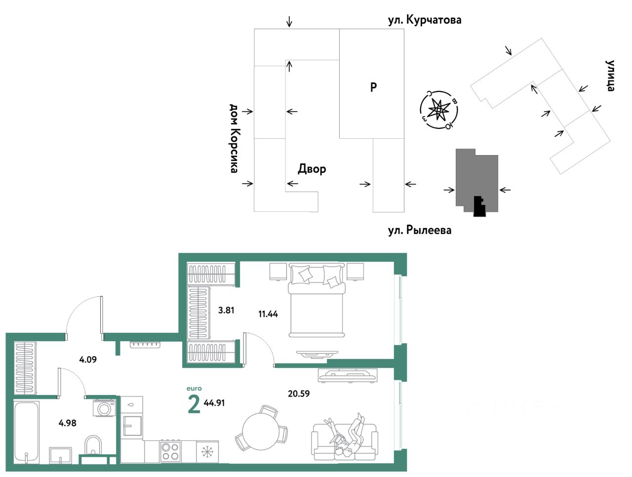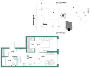 Продается 2комнатная квартира на 24 этаже от застройщика Страна Девелопмент. Площадь квартиры 44,64 кв. м.
